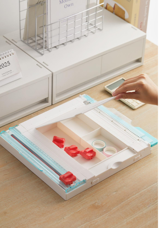 ◆ 机身自带收纳盒,抬起面板打开收纳盒,可收纳各种细碎工具&纸张素材。