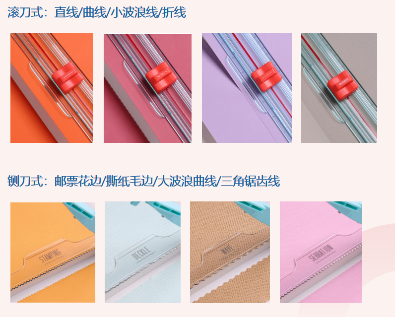 创新点:◆ 配有8种裁切花式刀头,定位专利压尺可视线;