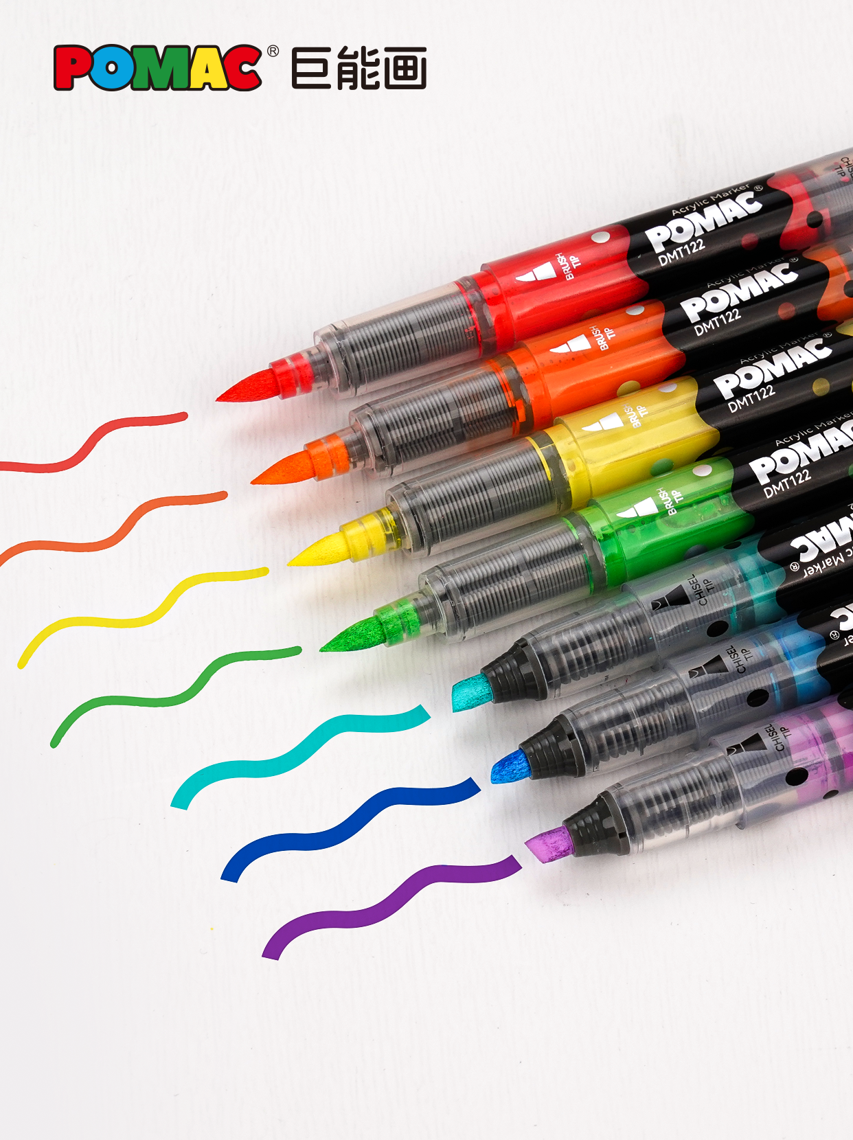 ◆ POMAC巨能画直液式丙烯马克笔此次展出产品品类涵盖单头/双头、软笔尖/硬圆头笔尖,均采用直液式控墨系统,大容量储墨,下笔丝滑流畅,出墨均匀稳定。