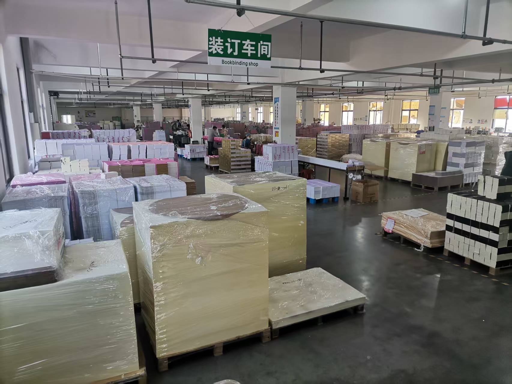 公司现有生产设备,高频烫金机14台,高周波熔断机1台,申达切纸机5台,柔印机1台,双面双色机2台,锁线机3台,热收缩包装机1台,摇臂冲皮机12台,铲皮机5台,压痕机6台,包边机16台,折页机4台,套页机2台,12联配页机1台,过胶线1台,无线胶装机1台,圆角机2台,全自动冲孔机1台,粘页机2台,缝线机16台,过胶机5台,龙工FD35(T)III型叉车3台。