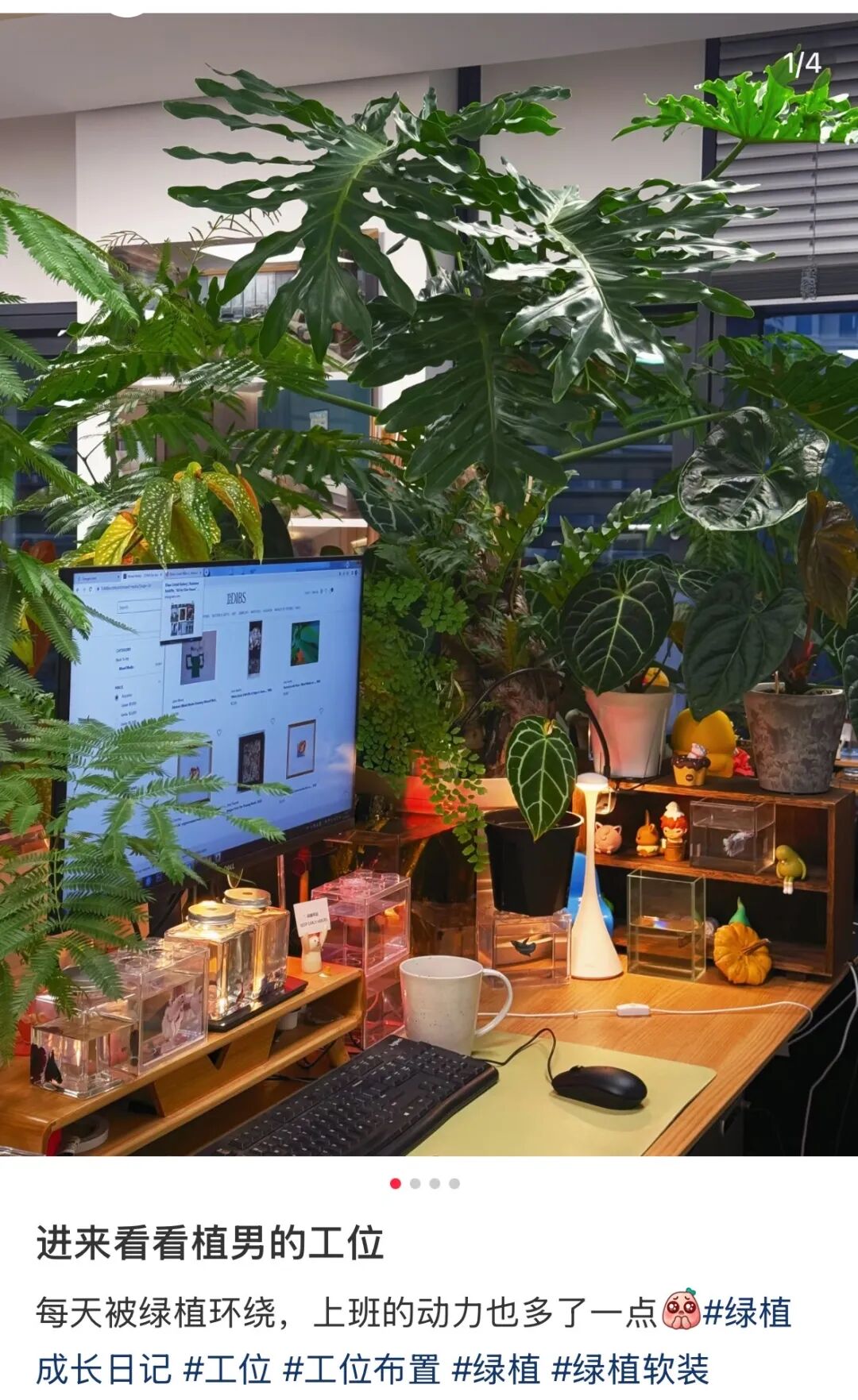 从多肉盆栽到苔藓微景观,从鱼缸造景到生态瓶,年轻人用绿色对抗着电脑辐射和空调干燥。有网友戏称:“在写字楼里搞出一小片‘森林’,是打工人对自己最后的疼爱。”