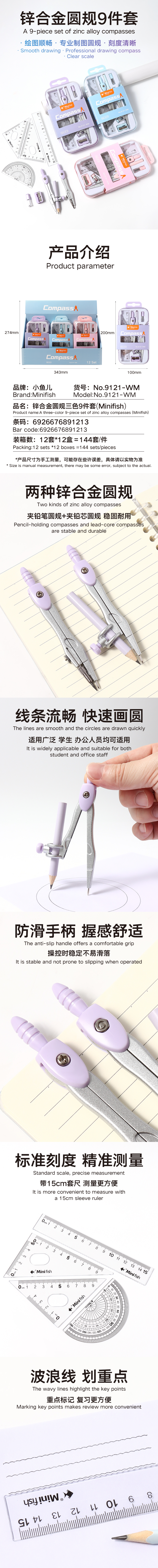 9121-WM Zinc alloy compass set of three colors - 9 pieces set