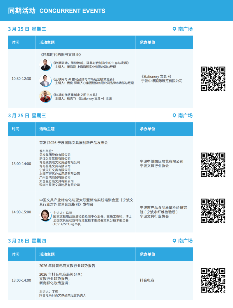 展会期间,“首发丨2026宁波国际文具展创新产品发布会”、“硅基时代的图书文具业”“2026年抖音电商文教行业趋势报告”“中国文具产业标准化与亚太联盟标准实践培训会“”《宁波文具行业对外贸易合规指引》发布会”等活动将轮番登场,邀请行业专家、企业精英、平台代表展开深度对话,为全球文具人提供前瞻洞察与战略指引。