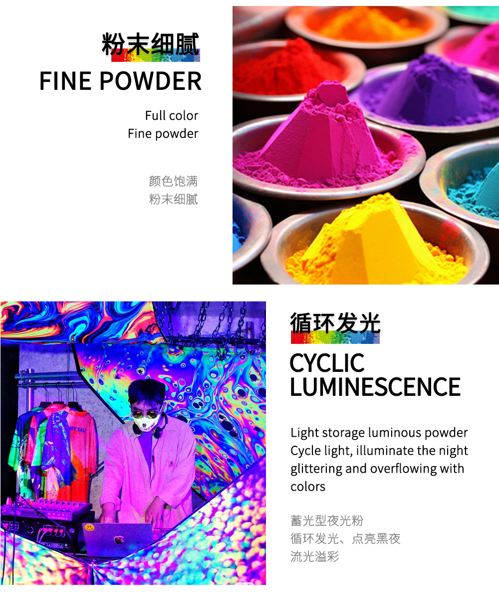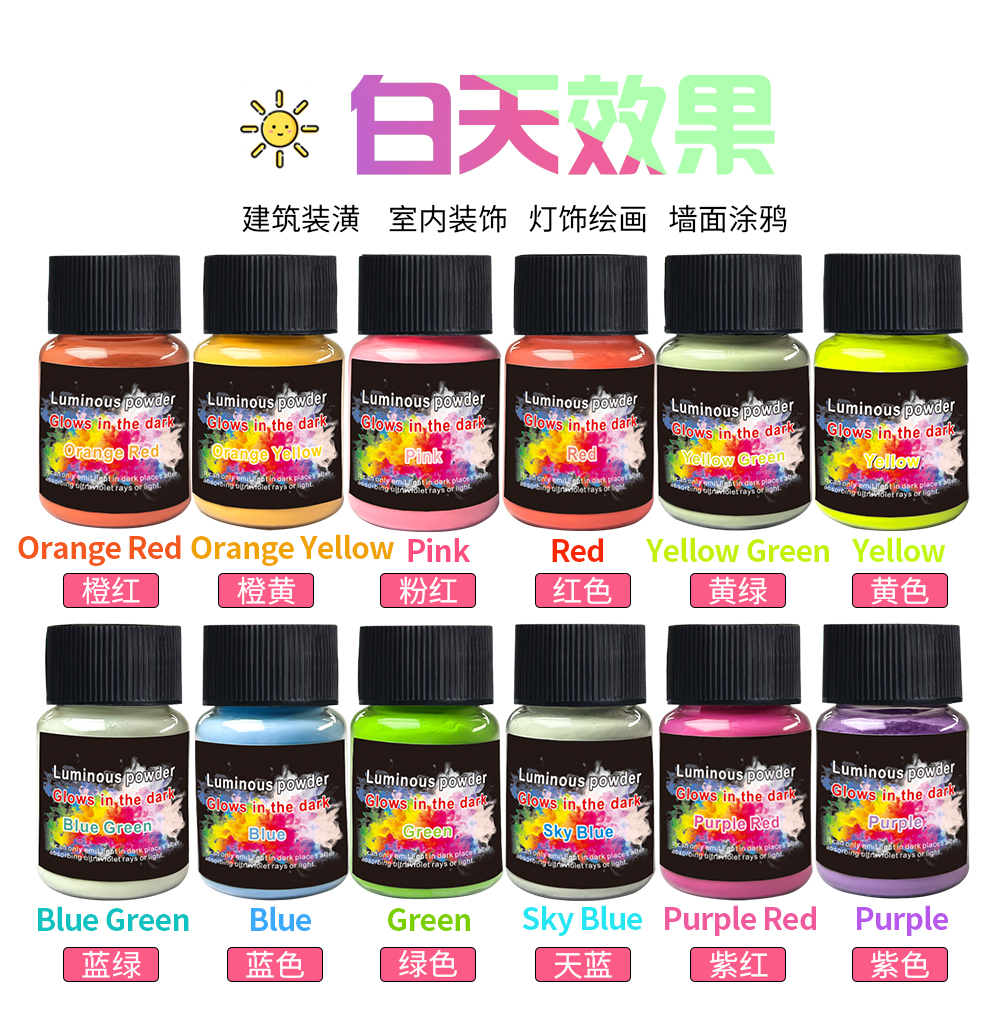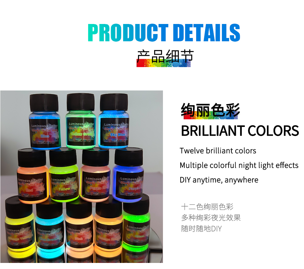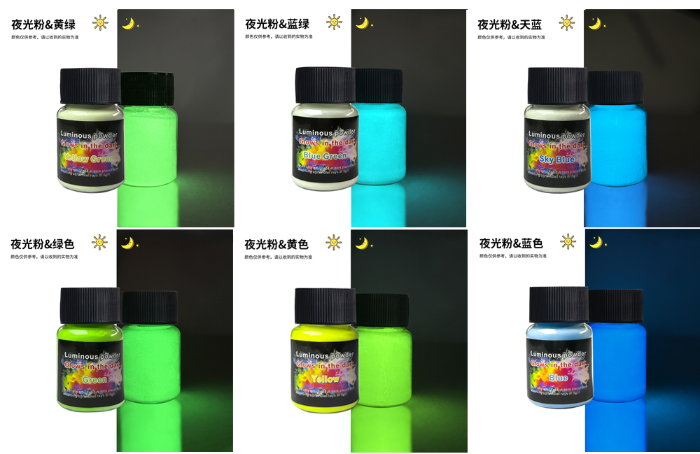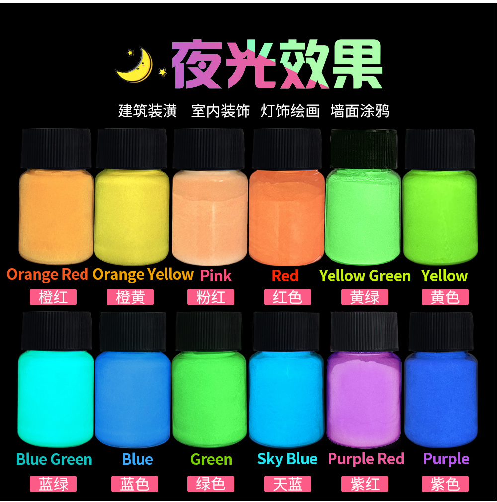 夜光颜料粉可以吸收普通光源并在黑暗中发光。可以搭配水彩颜料、DIY工艺品、环氧树脂、绘画、蜡烛等用途 Luminous pigment powder can absorb ordinary light sources and glow in the dark. It can be used with watercolor paints, DIY crafts, epoxy resins, paintings, candles, and other applications.