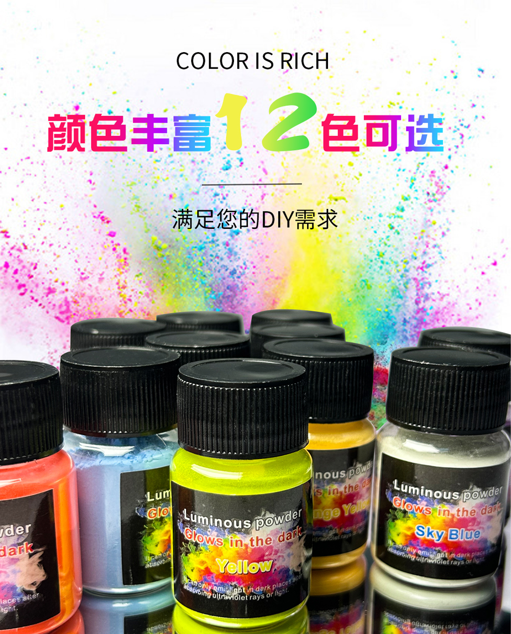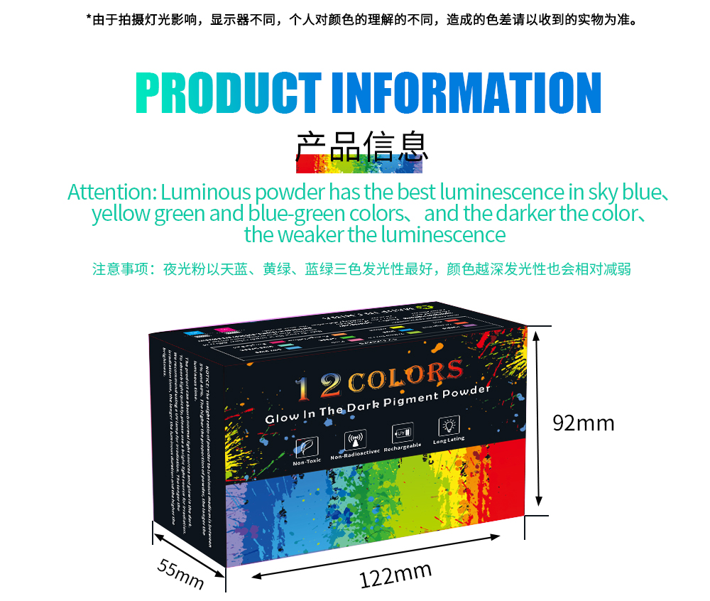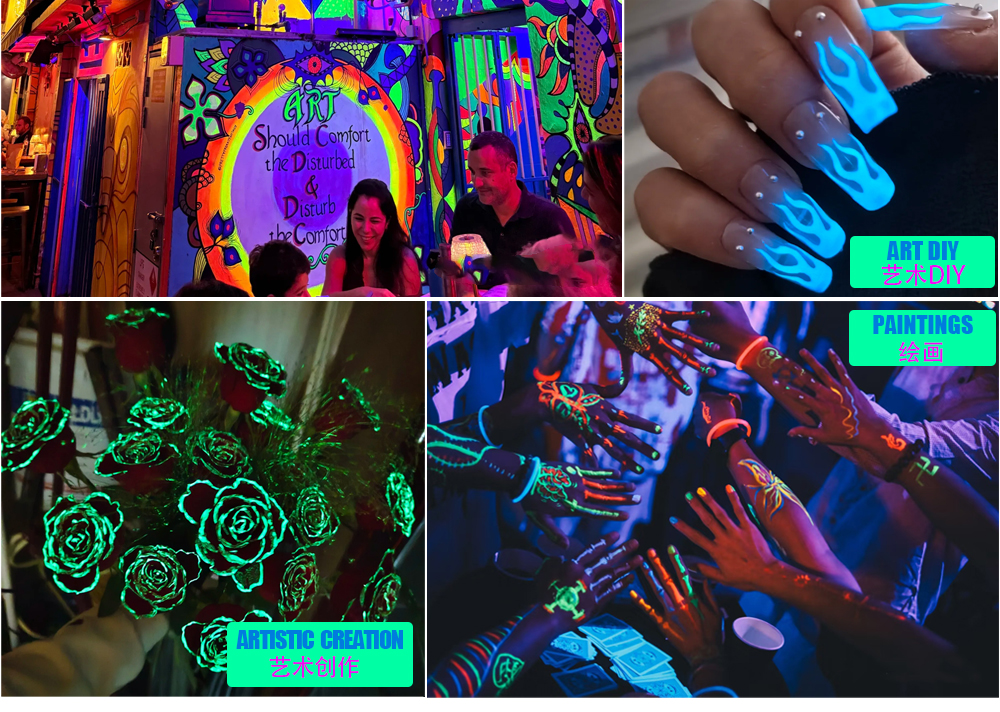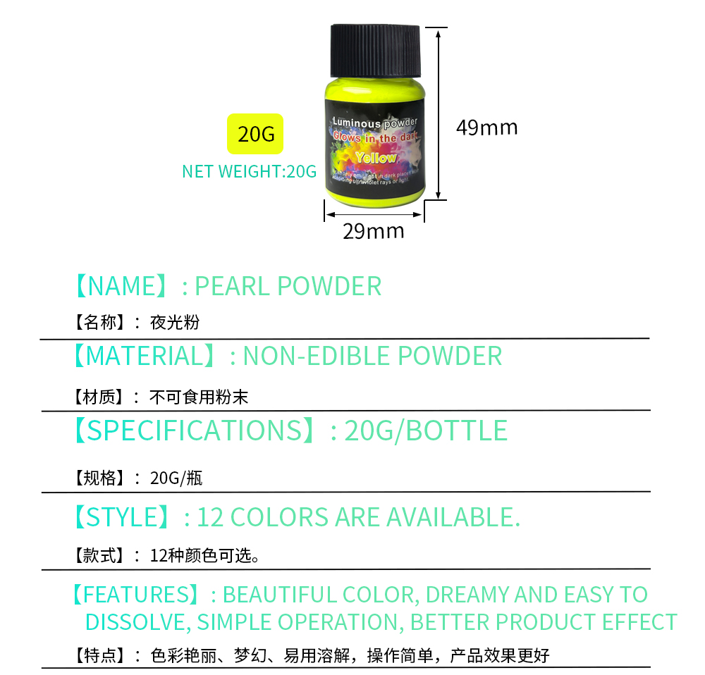 夜光颜料粉可以吸收普通光源并在黑暗中发光。可以搭配水彩颜料、DIY工艺品、环氧树脂、绘画、蜡烛等用途 Luminous pigment powder can absorb ordinary light sources and glow in the dark. It can be used with watercolor paints, DIY crafts, epoxy resins, paintings, candles, and other applications.