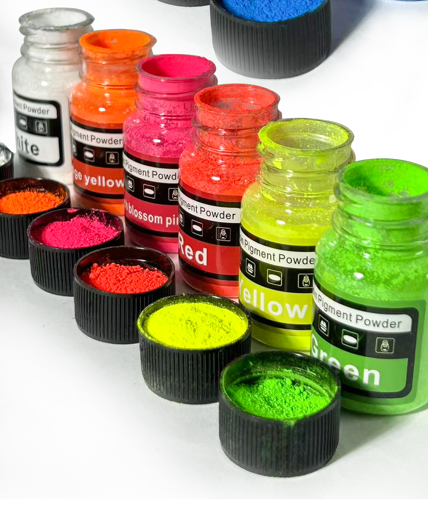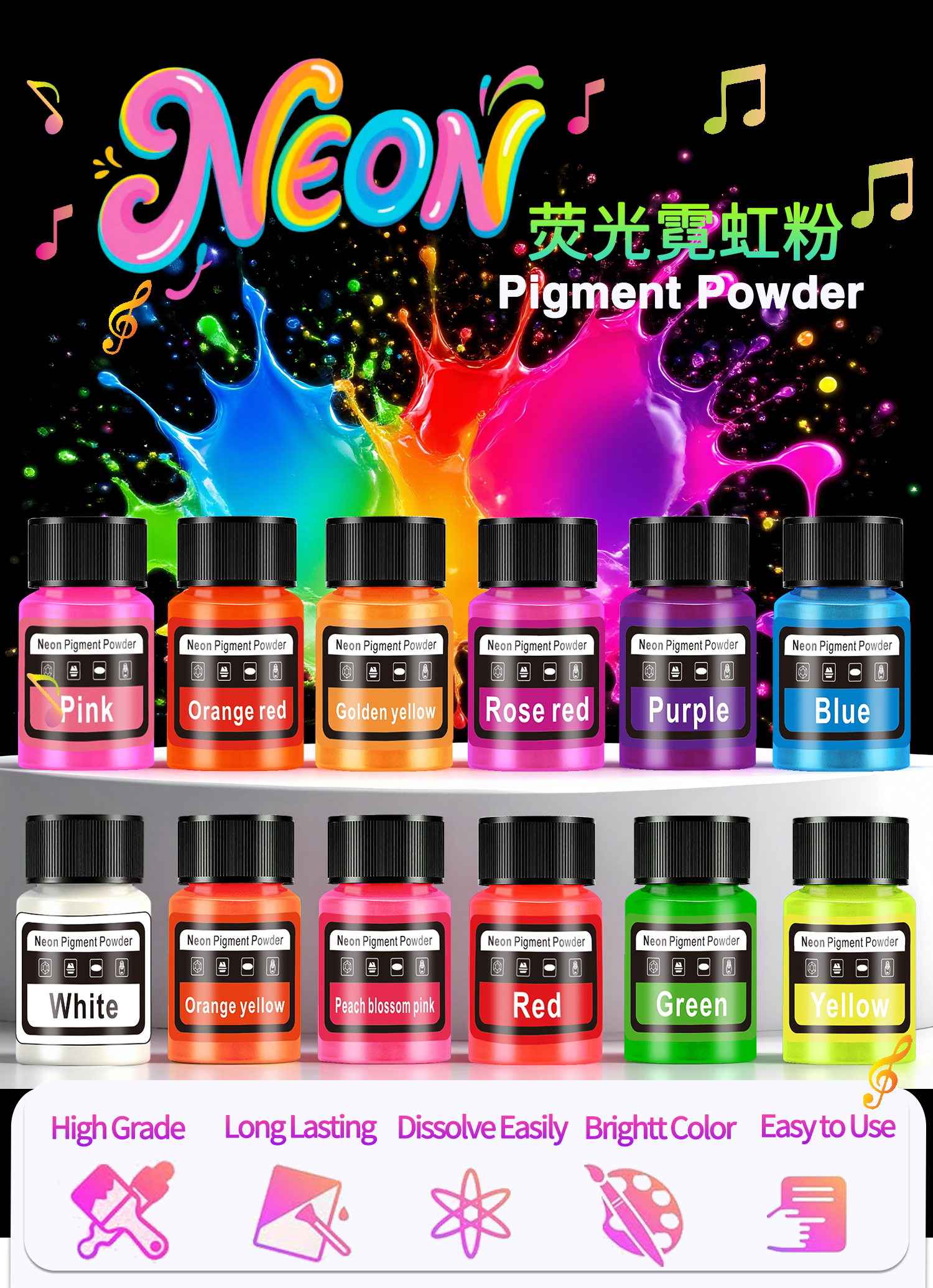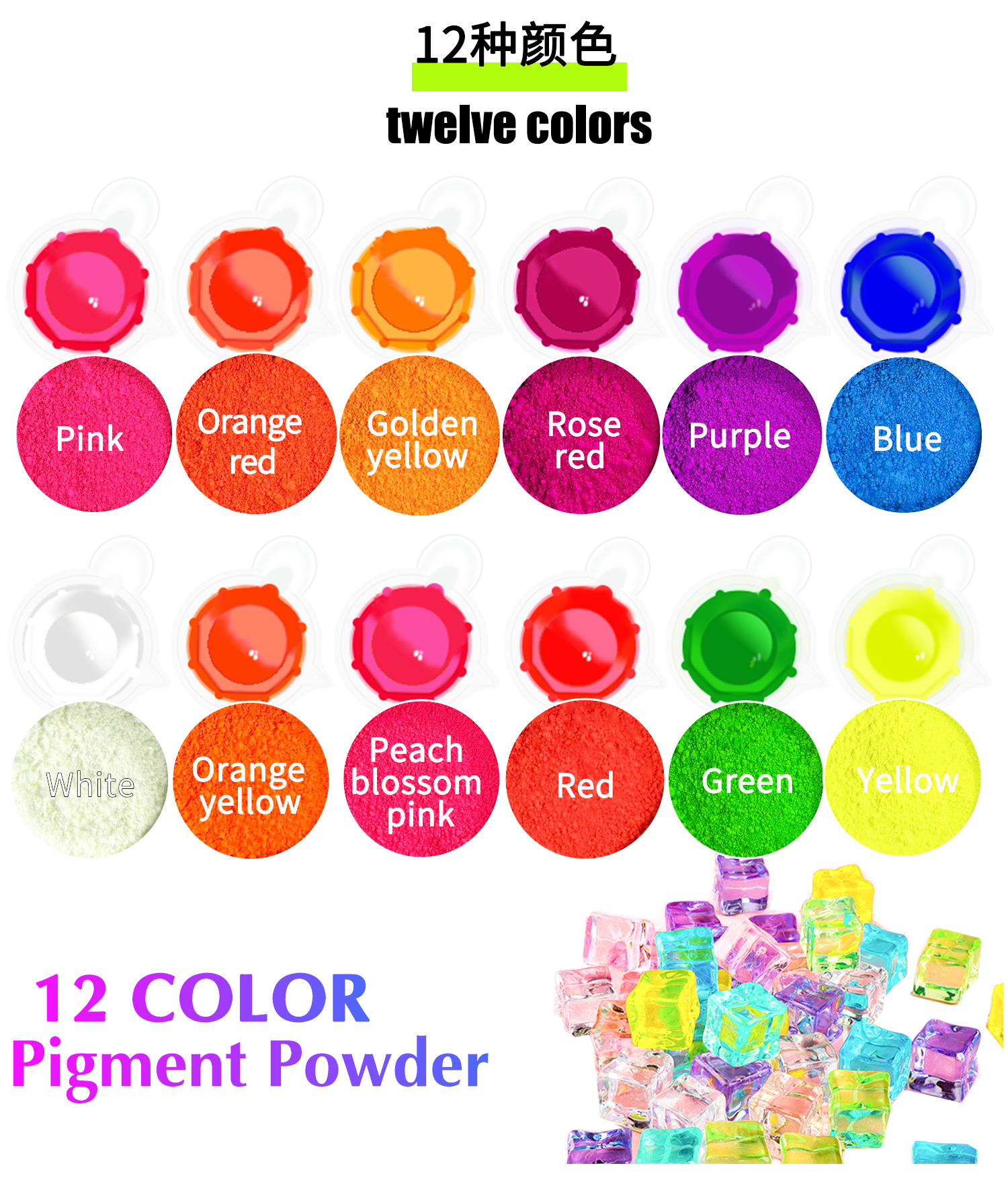 Thisneon pigment powder setincludes 12 bright,vivid shades.guaranteeingthatrich,vibrant hues will stand out in any project.