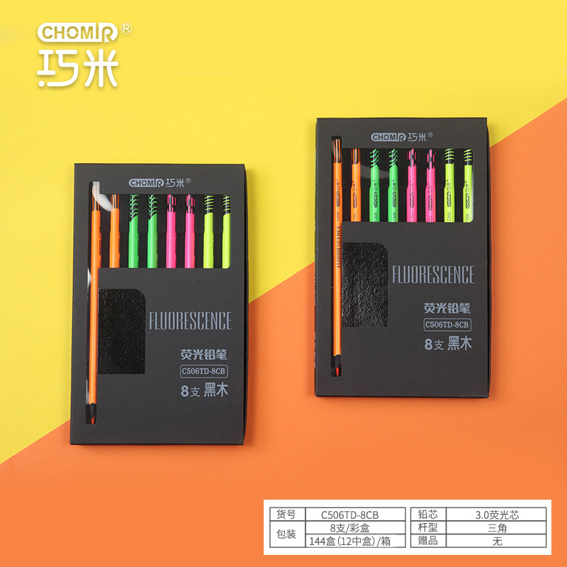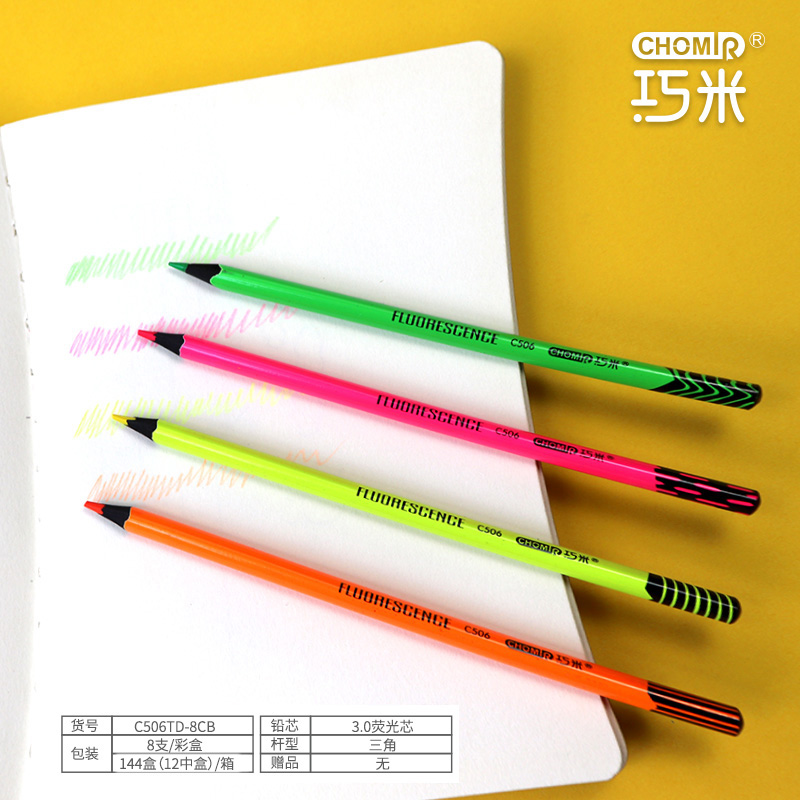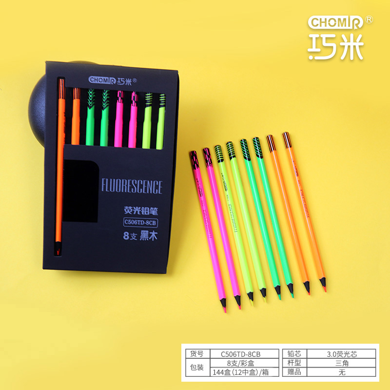 铅笔详情:7'', 椴木, 杨木,雪松可供选择, 3.0mm 荧光芯, 荧光漆, 切光,削尖,一面一色打印