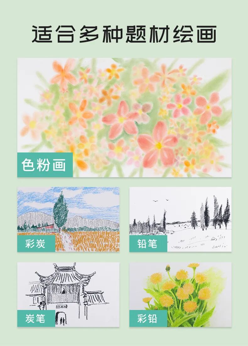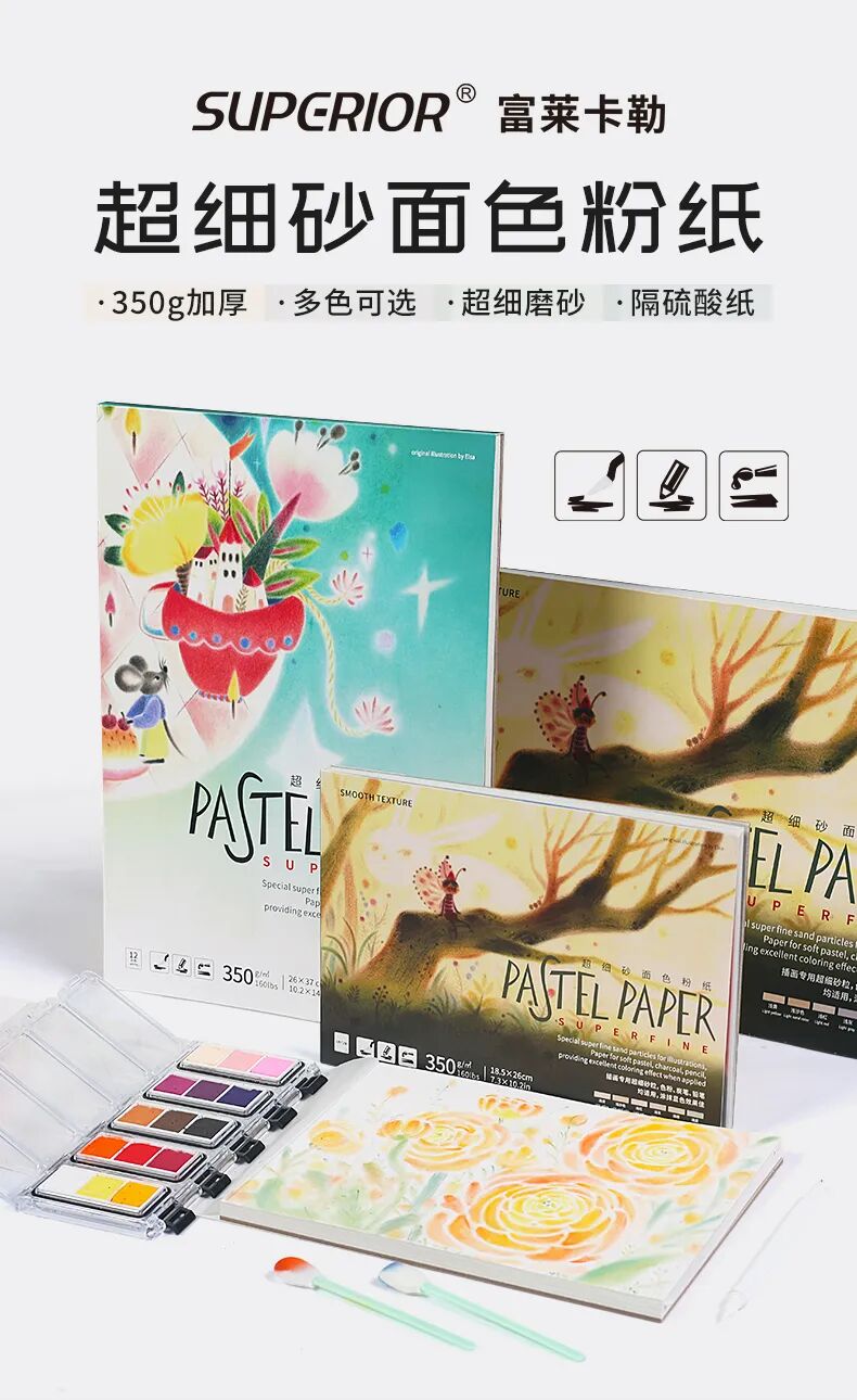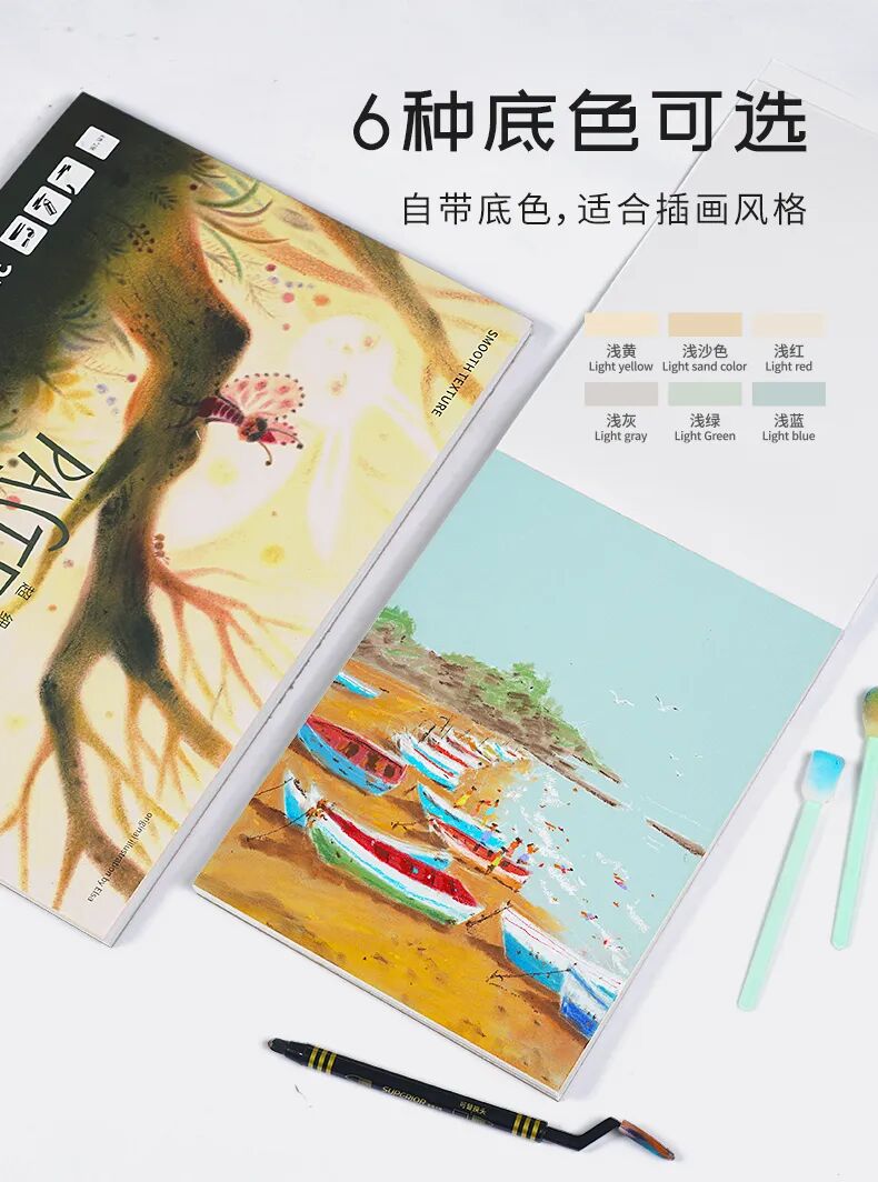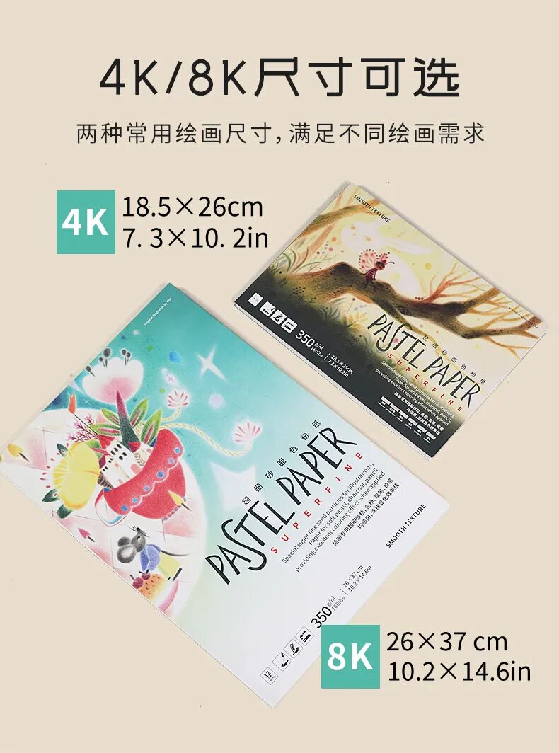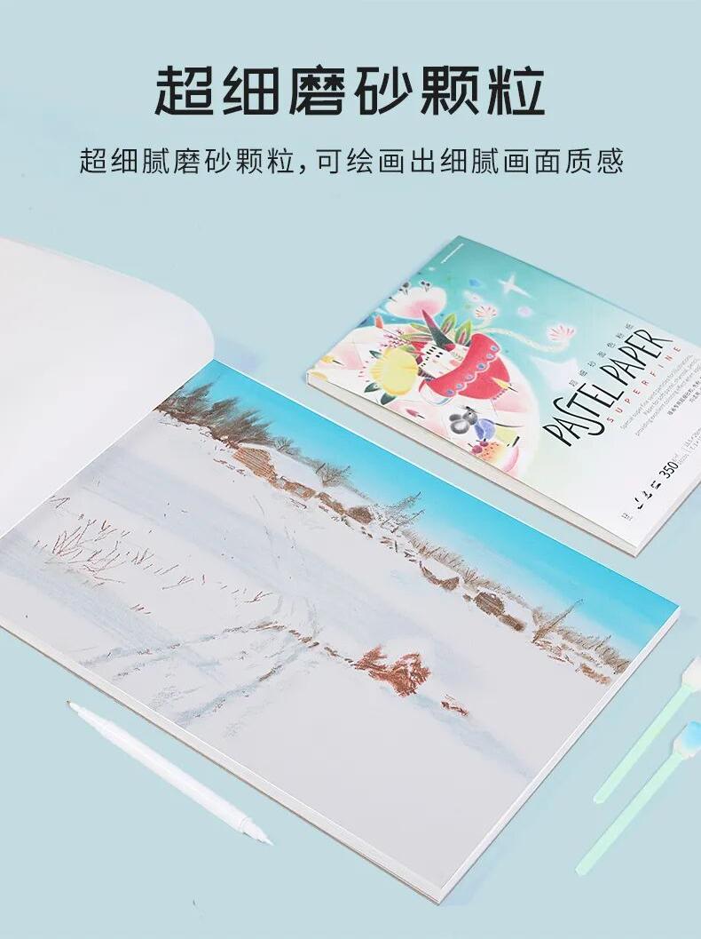 超细腻磨砂颗粒,可绘画出细腻画面质感;自带底色,适合插画风格,白色+6种颜色可选;两种常用绘画尺寸可选,满足不同绘画需求;350g/㎡加厚纸张可承受多次涂色整改,加水等操作;每张纸中间附赠一张硫酸纸,保护作品。